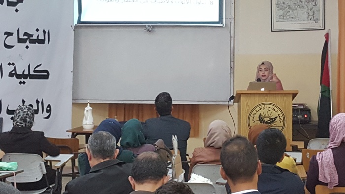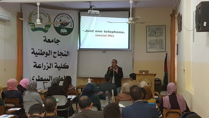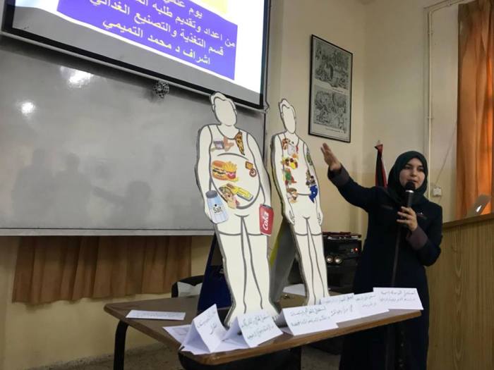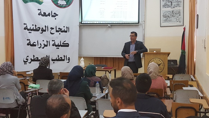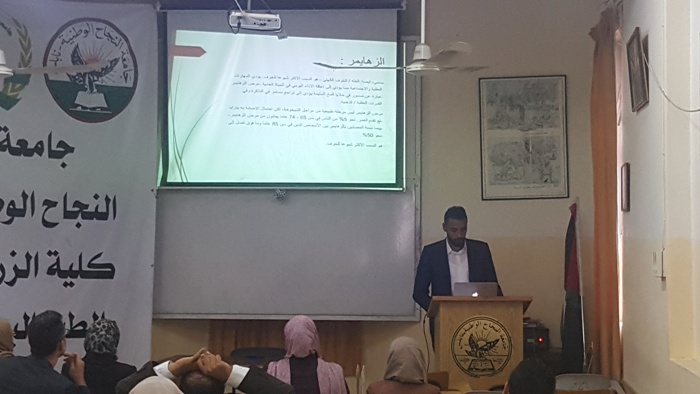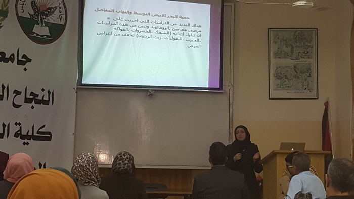 قسم التغذية والتصنيع الغذائي يقوم بيوم علمي عن حمية البحر الابيض المتوسط بحضور عدد من طلبة الدراسات العليا وطلبة كلية الزراعة والمهتمين من افراد المجتمع المحلي. وقد بدأ اليوم العلمي بتقديم من د محمد التميمي الذي وضح اهمية هذا اليوم والهدفين الرئيسيين من اقامته والممثلين بضرورة التوعية وارشاد الطلبة الى النمط الغذائي السليم والذي يقيهم الامراض ويزيد من انتاجيتهم. وكذلك بان التمسك بهذا النمط الغذائي التقليدي هو اسلوب للحفاظ على هويتنا الفلسطينية في ظل هجمة صهيونية تحاول ان تنسب لها تراثنا من الارض والمقدسات وحتى الغذاء ونمط العيش.