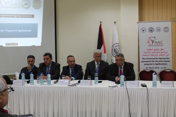شارك الأستاذ الدكتور ماهر النتشة القائم بأعمال رئيس جامعة النجاح الوطنية و رؤساء جامعات الخليل وفلسطين التقنية" خضوري" والقدس بتوقيع إتفاقية برنامج ماجستير الأعمال الزراعية الربحية المشترك ما بين الأربع جامعات، والذي يعد الأول من نوعه على مستوى الوطن العربي حيث يهدف البرنامج الى ربط التعليم الزراعي بسوق العمل الزراعي والصناعة الزراعية ، بدوره أكد الأستاذ الدكتور القائم بأعمال رئيس الجامعة ضرورة العمل الجاد في هذا البرنامج ليكون نموذج يحتذى به لإنجاح مشاريع التعاون الأكاديمية ما بين الجامعات الفلسطينية.