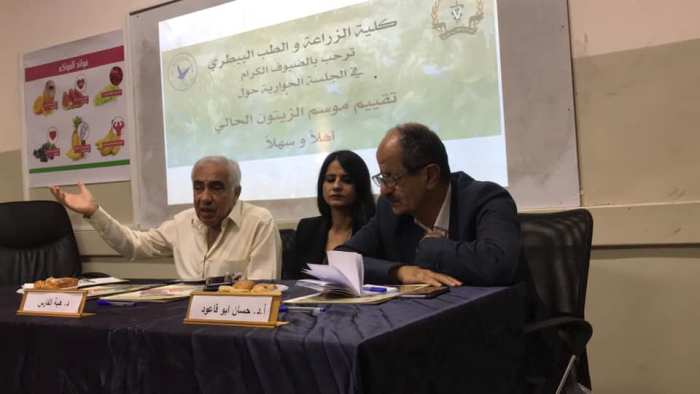 نظم قسم الإنتاج النباتي والوقاية في كلية الزراعة والطب البيطري يوم الأربعاء الموافق 13/11/2019 جلسة حوارية حول تقييم موسم الزيتون الحالي حيث شارك في الجلسة عدد من المختصين في قطاع الزيتون من وزارة الزراعة، وجامعة فلسطين التقنية، وأكاديمية فلسطين للعلوم والتكنولوجيا، والإغاثة الزراعية، ومزارعين و خبير الزيتون المهندس فارس الجابي. كما حضر اللقاء عدد من أعضاء الهيئة التدرسية في الكلية وكذلك عدد من طلبة القسم من مستوى السنه الثالثة والرابعة.
