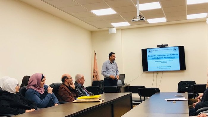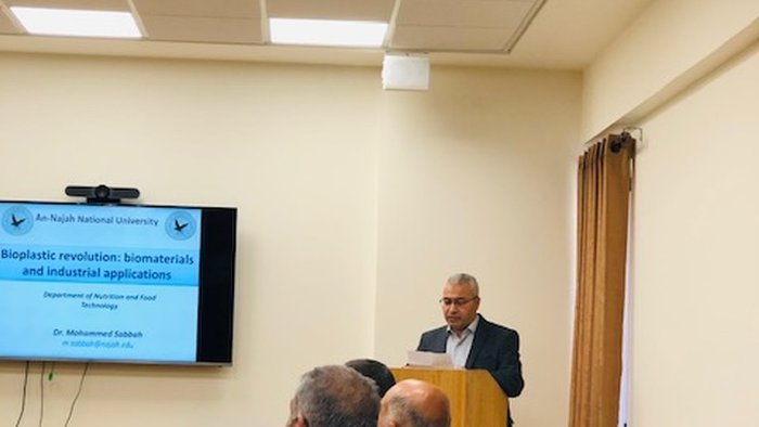 وتطرق الدكتور محمد صباح الى مصادر البلاستيك الحيوي والذي في العادة يكون من مصادر طبيعية من الكربوهيدرات والبروتينات وكذلك الليبيدات مع إضافة بعد المواد لتحسين الخصائص التصنيعية للمنتج النهائي. حيث يشهد العالم اليوم تصنيع اغلفة ليست فقط صديقة للبيئة وانما قابلة للأكل. وعرض د. صباح العديد من نتائج الأبحاث التي نشرها خلال الدكتوراة والتي تظهر قابلية تطبيق هذه المواد في تغليف الاجبان والفواكه واللحوم وذلك من اجل زيادة صلاحيتها.